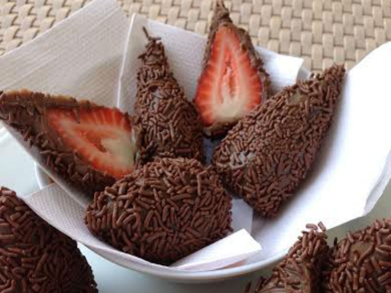- Com outra medida da colher de brigadeiro, cubra o morango;
